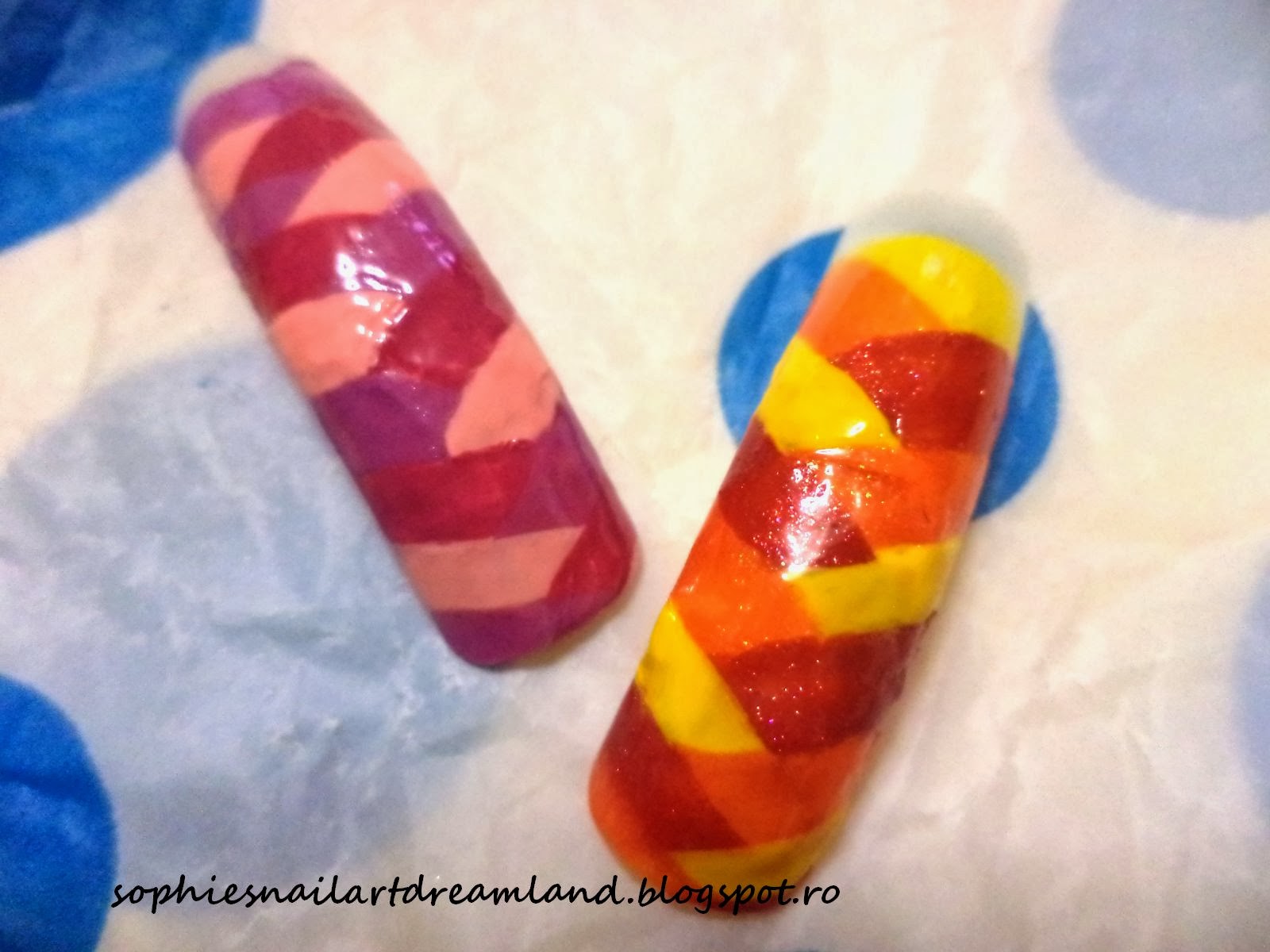 Deoarece tema de saptamana trecuta a fost "fishtail nails", un model care arata bine pe unghii lungi, nu am putut sa recreez modelul pe unghiutele mele, din cauza aspectului lor, asa ca am decis sa pictez doua tipsuri/unghii false, folosind aceasta tehnica, si una din unghiile mele (cea mai lunga in momentul respectiv).